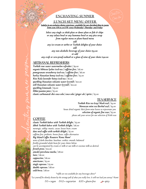 Curate your warm fall experience, available for dine-in Wednesday to Friday, am to : pm. Indulge In Your Choice Of Any Single Order Of xShish Plate, Doner Plate, Falafel Plate, Fish & Chips, Any Salata with Choice Of Protein or Any Pita Wrap. Elevate Your Experience With A Sweet Finish Of Ice Cream, Sorbet, or Turkish Delights, Complemented By Your Choice Of A Non-Alcoholic Beverage For $, or A Craft Or Zero-Proof Cocktail, or A Glass Of Wine or A Craft Beer For $.