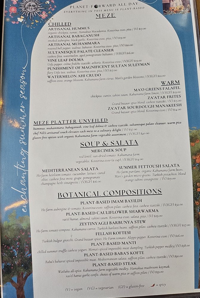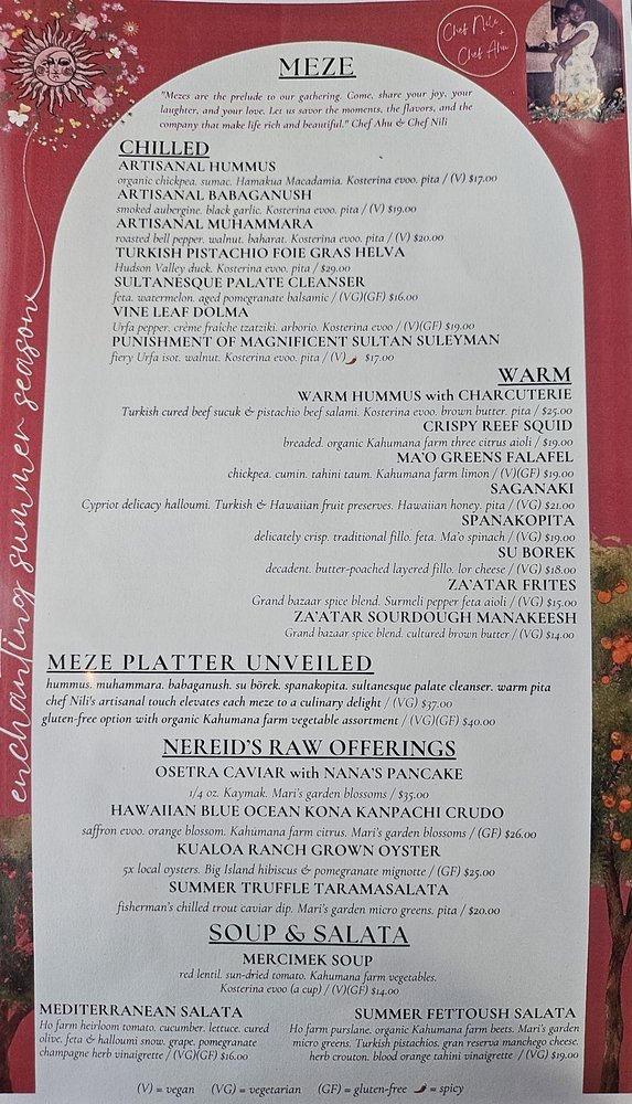 Hummus. Muhammara. Babaganush. Sultanesque Palate Cleanser. Spanakopita. Su Borek. Fig Balsamic Glaze. Whole Aegean Cured Olives. Cultured Red Cabbage. Kahumana Farm Limon Agrumato. -Hour Fermented Sourdough Pide (VG)