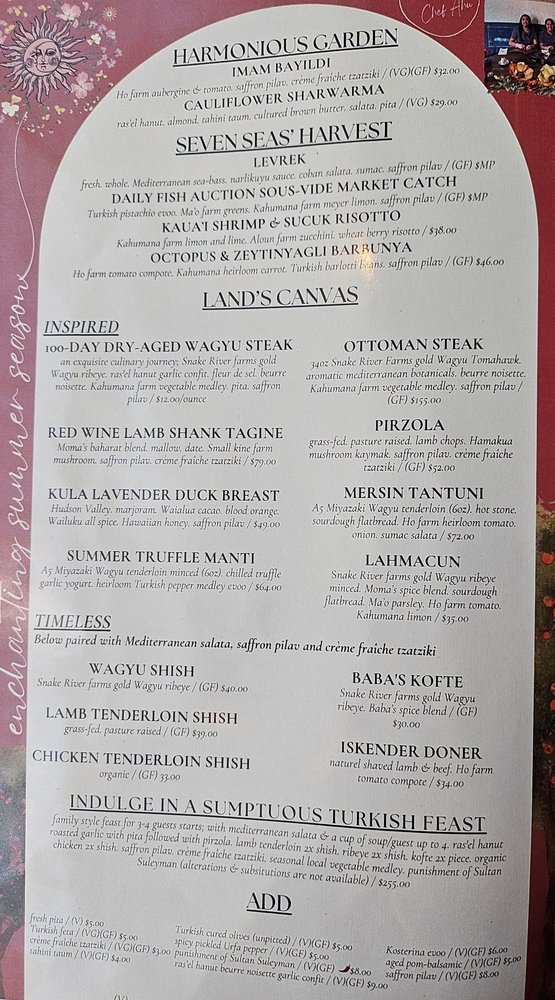 Begins with Mediterranean Salata and Soup for Each Guest Up To Guests. Ras el Hanout Roasted Garlic With Warm Pide. xShish of Lamb Tenderloin. xShish of Wagyu Ribeye. xShish of Organic Chicken. xBaba's Kofte. Sultan Suleyman's Punishment Sauce. Safran Pilav. Creme Fraiche Tzatziki. A Seasonal Vegetable Medley (Alterations & Substitutions Not Available)